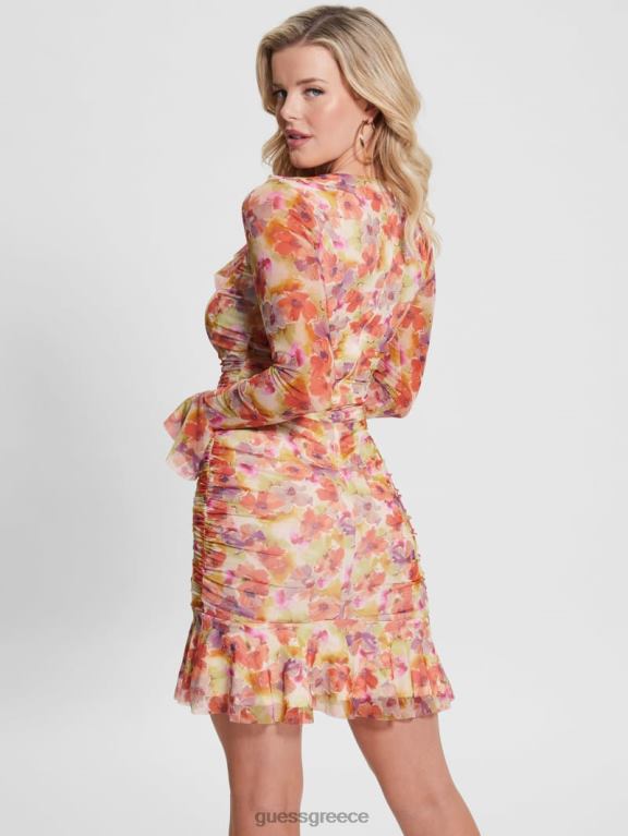 GUESS γυναίκες οικολογικό ροζ φόρεμα με βολάν άνθιση ακουαρέλας ενδύματα J46DJ377
