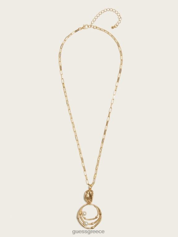 - κολιέ σε χρυσό στολισμένο με κρεμαστό κόσμημα με αφηρημένο σχέδιο δαχτυλιδιού με στρώσεις με μαργαριταρένιες πινελιές και σφυρήλατο ανάγλυφη βάση